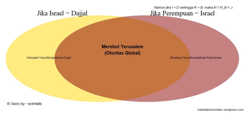 Himpunan A merepresentasikan fungsi tokoh penakluk Dajjal, dalam kepercayaan lain. Sedangkan himpunan H_B menggambarkan struktur fungsional Binatang dalam kitab Wahyu. Ketika “Merebut Yerusalem” muncul di kedua sisi (kolom Elemen 2 pada tabel diatas), maka hanya itulah elemen yang menjadi titik irisan konseptual, dan hanya berlaku jika Israel dipandang sebagai Dajjal. Kita mulai..