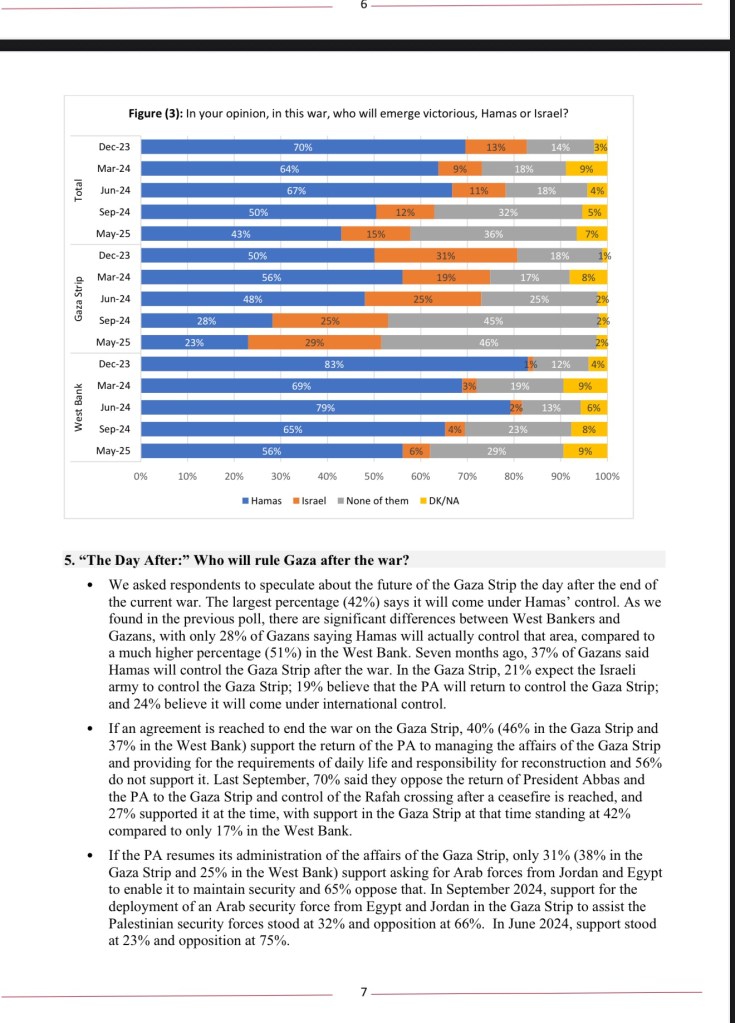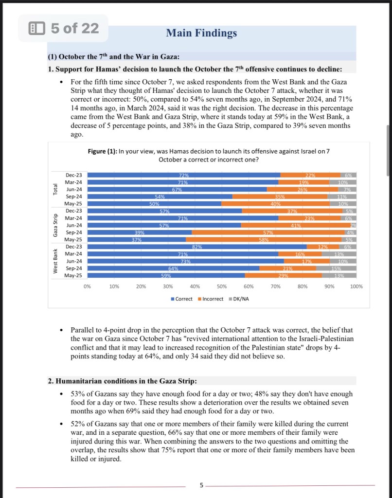 Dan supaya lebih jelas, saya juga melihat data survei terbaru yang di publikasi dari Palestinian Center for Policy, pada Mei 2025: dukungan rakyat terhadap keputusan Hamas meluncurkan serangan 7 Oktober makin menurun. Dari 71% dibulan Maret 2024, sekarang hanya 50% yang bilang itu keputusan benar. Artinya, ada penurunan. Mungkin rakyat sendiri mulai ragu pada strategi mereka. Tapi menurun nya angka tersebut saya ngga ngerti, apakah karena 21% itu telah meninggal oleh serangan Israel, atau memang mereka berubah pandangan.